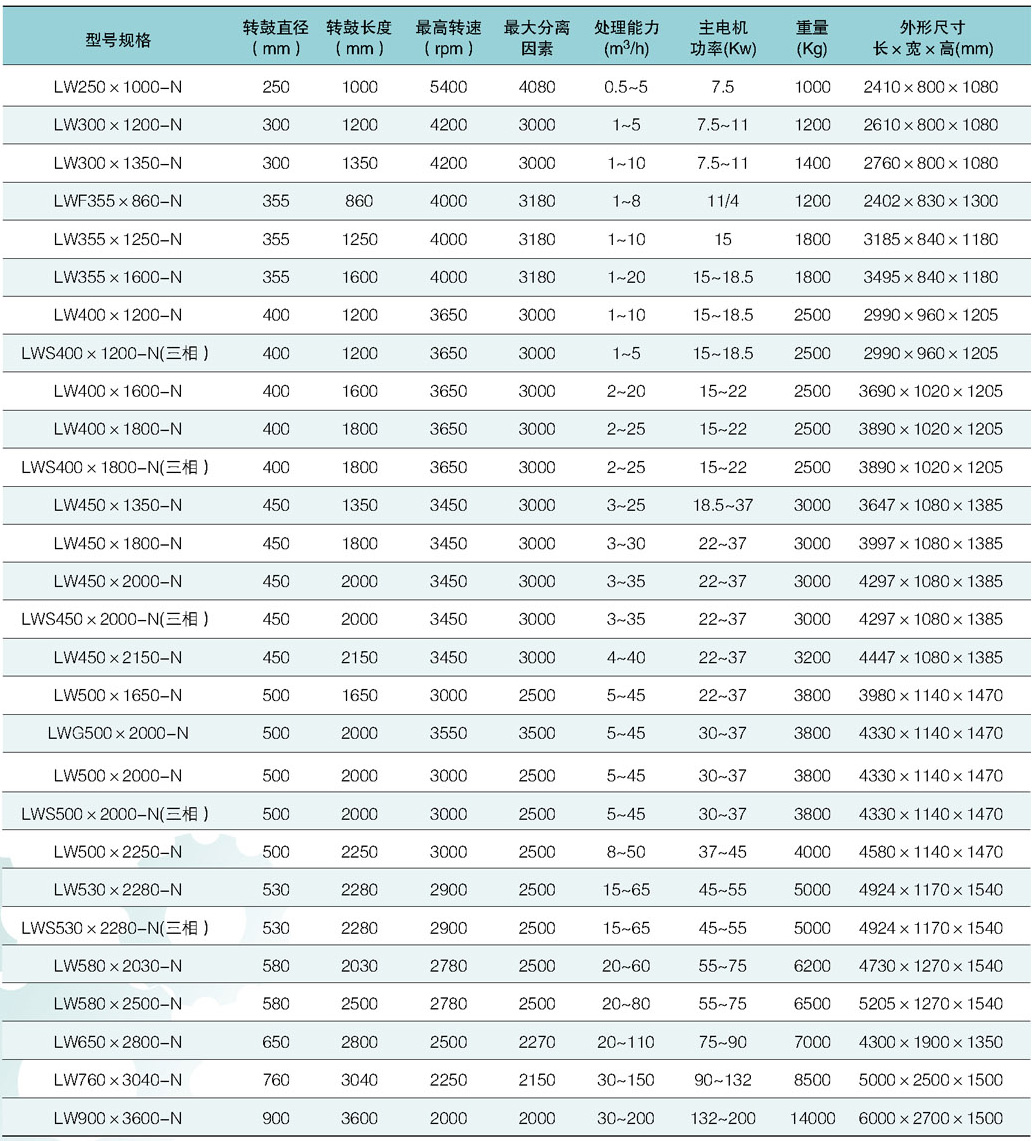 三、卸料沉降臥螺離心機(jī)的產(chǎn)品主要型號及技術(shù)參數(shù)